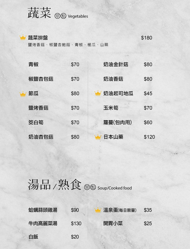 【餐點類型】美國牛/和牛/套餐/豬雞鴨海鮮/蔬菜/湯品熟食/清酒/啤酒/生啤/氣泡酒/無酒精飲品