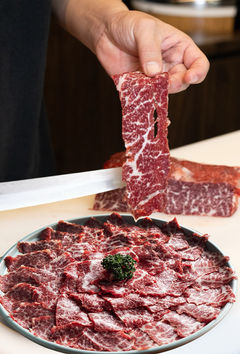 選用每日新鮮的台灣黑牛,透過職人在開放式的前台當場現點現切現出,靠近就能欣賞到新鮮牛肉手工薄切的過程,細膩的刀工切成片狀四個角平整均勻令人驚嘆,是一般切肉機無法呈現的狀態。